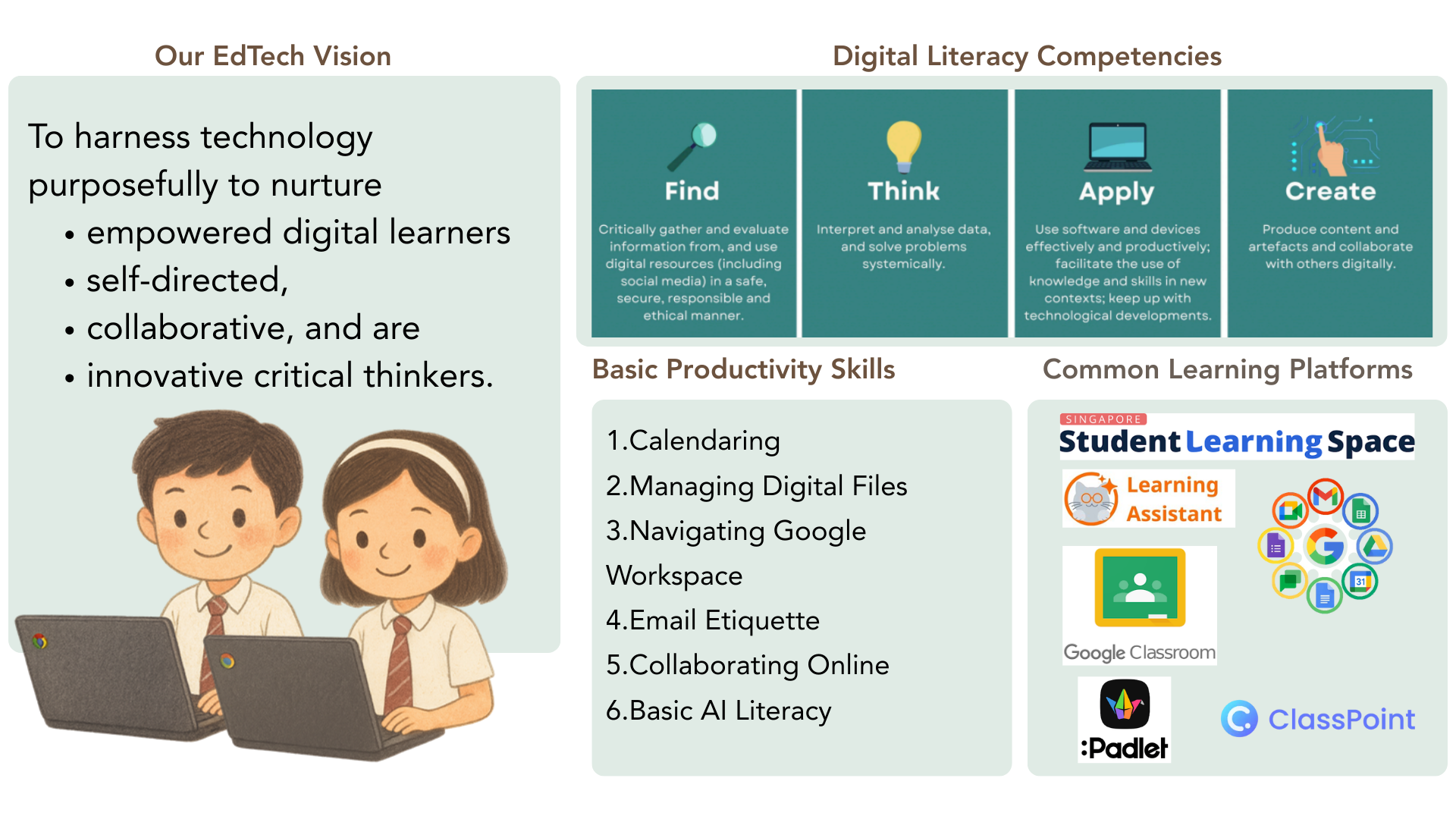 The MOE DMA solution for Chromebooks, Lightspeed Systems®, will be installed on all students’ PLDs to support safe and responsible device use. The DMA is funded by MOE and applies to both school-purchased and approved student-owned devices used in place of the school-prescribed PLD. Students will be guided to install the DMA after device collection on the PLD Onboarding Day. The DMA will be uninstalled when students graduate from or leave the school.